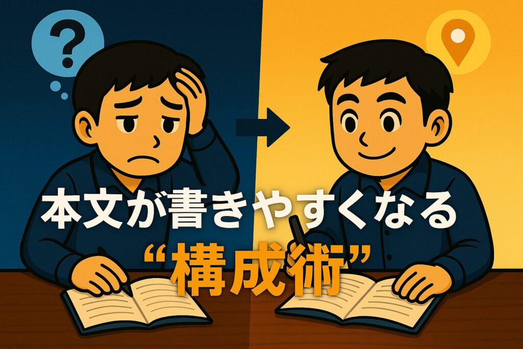 本文が書きにくい原因は、書く力ではなく“構成の見えにくさ”にあります。読者の知りたい順番で流れを作り、見出しを道案内のように配置するだけで、文章は驚くほど書きやすく、読みやすく整っていきます。 -
