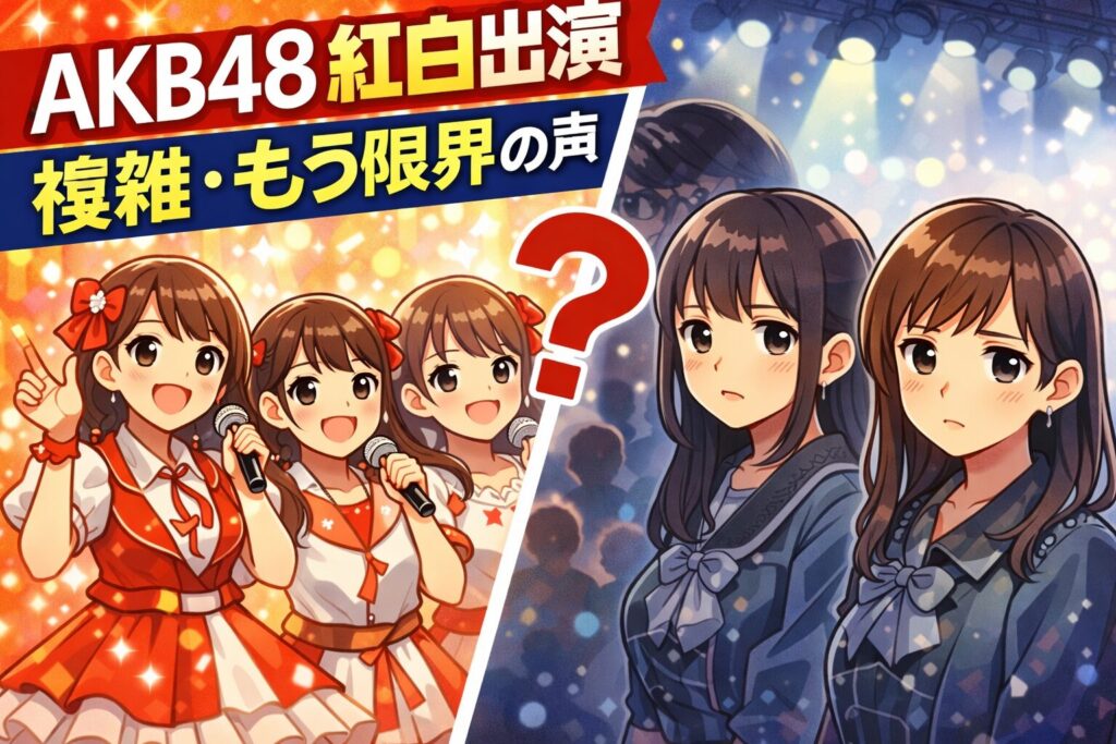年末の紅白歌合戦でAKB48が登場した瞬間、胸が高鳴った人もいれば、どこか引っかかる気持ちを抱いた人もいたはずです。かつて時代の中心にいたグループが再び大舞台に立つ姿は、懐かしさと同時に、言葉にしにくい感情を呼び起こしました。「うれしい」はずなのに、なぜか素直に喜べない──そんな違和感や複雑な気持ちを覚えた人は少なくありません。SNSでは「もう限界では?」という声まで上がり、AKB48の紅白出演そのものに疑問を投げかける空気も広がりました。この記事では、あの瞬間に多くの視聴者が感じたモヤっとした感情の正体を、今のAKB48を取り巻く状況と重ねながら、丁寧にひも解いていきます。