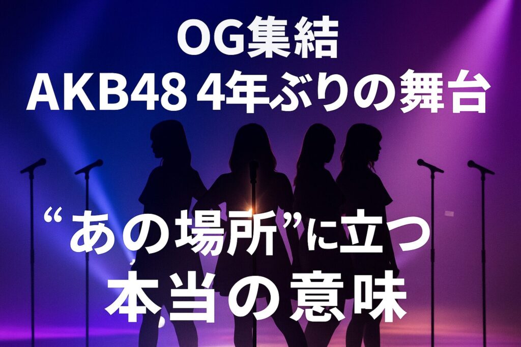 この記事では、今回の4年ぶり復帰が持つ本当の意味、OG集結の背景、そしてAKB48が今どこへ向かおうとしているのかを、初心者の方にもわかりやすく丁寧に読み解いていきます。