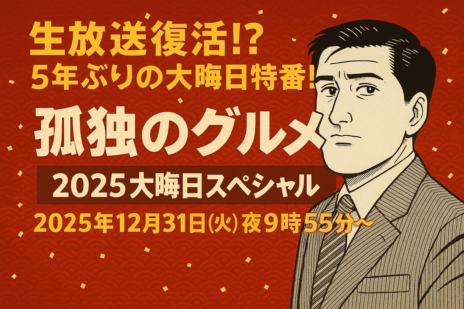 2025年の大晦日も、『孤独のグルメ』は一年の締めくくりを彩る恒例番組として帰ってきます。正式タイトルは「孤独のグルメ2025 大晦日スペシャル(仮)」で、放送局は例年どおりテレビ東京系。放送日時は**2025年12月31日(水)夜9時55分〜**の予定となっており、年越し前の落ち着いた時間帯に、今年も井之頭五郎が温かい食事と人々との出会いを届けてくれます。番組は深夜ドラマの空気感をそのまま残しながら、年末特番らしい“特別な夜”を感じさせる構成になる見込みです。