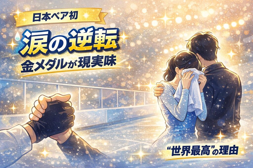 まず押さえたいのは、りくりゅうの“逆転劇”は金メダルが現実味を帯びるほどのインパクトだった、という点です。結果だけ見ると「メダル確定すごい!」で終わりがちですが、画面越しでも手が止まってしまうくらい、一瞬で流れが変わった勝負所がありました。私も思わず「ここで決まるの…?」と息をのんでしまったほどです。フィギュアに詳しくなくても大丈夫。 この記事では、話題の「世界的カップル超え」と言われた理由や、フリーで何が起きたのかを、専門用語をなるべく避けてやさしく整理します。読み終わる頃には、ニュースの見出しが**“納得できるストーリー”**に変わるはずです。