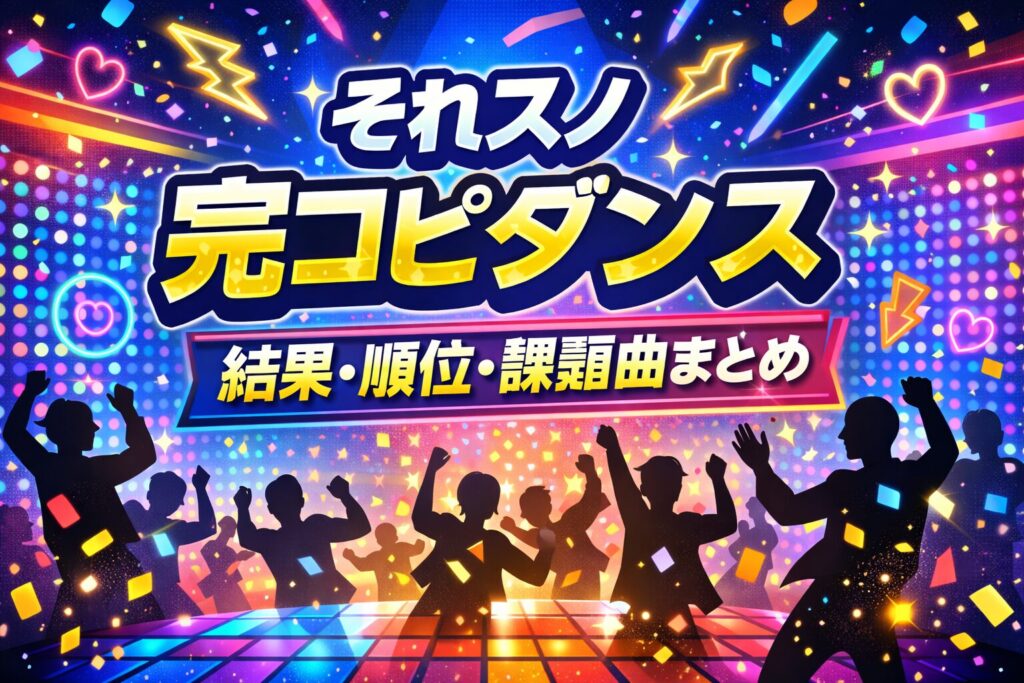 完コピダンスチャンピオンは、ただ振りを間違えずに踊れる人が勝つ…というより、見ている側の心を一瞬でつかむ「完成度」と「魅せ方」がそろったときに決まる印象です。『それスノ』の完コピは、音の取り方、体の角度、止めのキレ、視線や表情まで含めて、細部で「本物っぽさ」が出るかが勝負どころ。ほんの数ミリの腕の高さや、着地の音の“置き方”が揃うだけで、こっちのテンションまで一気に上がるんですよね。さらに怖いのが、緊張で呼吸が浅くなる終盤でも、スピード感を落とさず「余裕ある顔」を保てるか。そこが崩れると、上手いのに“惜しい”で終わってしまう。だからこそ全50曲の重みの中で集中力を切らさず、最後まで丁寧に積み上げた人が強い。見ているこちらも思わず息を止めて、次の瞬間に拍手したくなる——そんな説得力が最後の一押しになります。ここから先で、結果・順位・課題曲の流れと一緒に“勝負の場面”を整理します。読み終わるころには、「あの瞬間だけもう一回見たい…」が止まらなくなるはずです。結論:ここで差がついたのは、“完コピ”の先の感情の乗せ方でした。