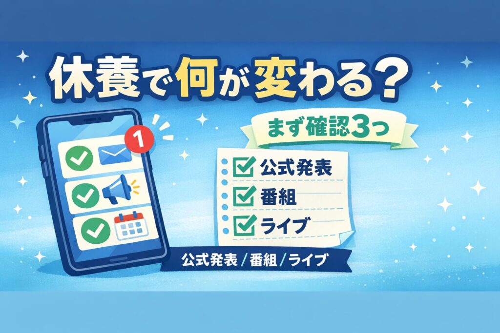 今回の休養ニュースで大切なのは、理由を当てにいかず公式発表と影響の整理に絞って追うことです。まず「変わること/変わらないこと」を分けると、不安が小さくなります。出演が一部お休みになる可能性はあっても、休養=引退と決めつける必要はありません。確認は①事務所・番組公式など「誰の発表か」②期間や表現(当面・一部など)③次の更新場所の3点だけで十分です。番組やライブは対象ごとに公式の更新を見て、代役や差し替えの有無を確かめましょう。情報が出ていない時は「未定」ではなく「まだ告知がない」だけのことも多いので、無理に答えを探さず更新待ちでOKです。SNSは心配と応援の空気感を知る参考に留め、断定や憶測には近づかない。読者には「ゆっくり休んで」「待ってるよ」と相手のペースを尊重する言葉が一番やさしい応援になります。そうすると記事の信頼が上がり、安心して読んでもらえます。焦らずで大丈夫です。